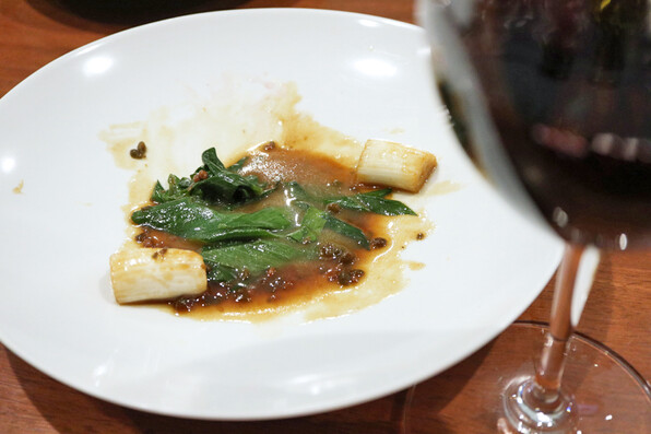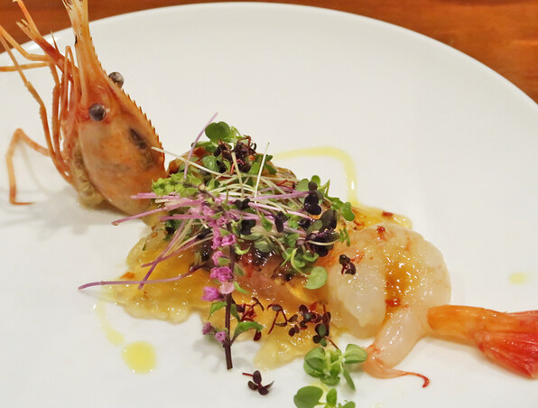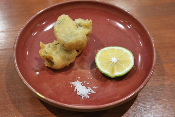 ●さて「リストランテ 野呂」でまず供されたのは、紫ずきんのフリットと、トマトに胡麻香味ソース。