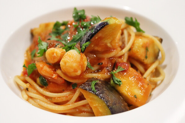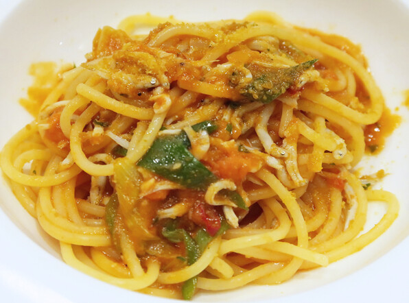 ●15日、スパゲッティを、温製でトマトソース、賀茂茄子、山盛りいくら