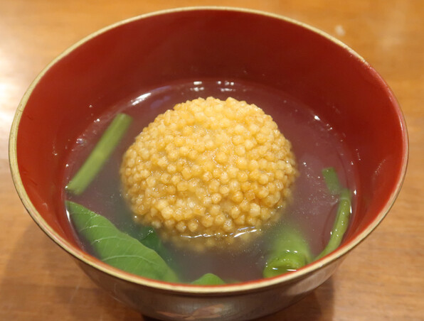 ●上に出した、コロッケね。コロッケの中にも、外の魚スープにも紫ずきん=黒豆の枝豆入り。