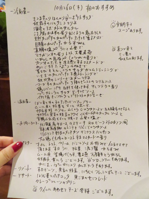 ●栗の甘さに、フォルマッジョの塩気やオリーヴオイルの香りがよく合って、まあ旨いったらないのです。感動深いおいしさでした。もうもう幸せです。世界でいちばんおいしいものをわたし食べているなあと思ったのでした。これはまたリピートします。いやパスタでやってもらおうか次は。