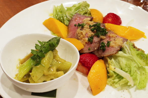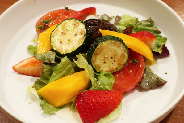 ●彩り美しいサラダ、苺やマンゴー入りで酸味や甘味も心地よく旨いったらない。