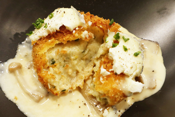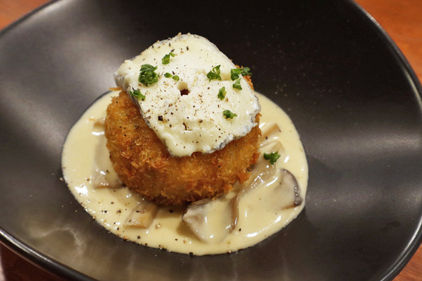 ●桜ますと海苔のコロッケ、上にサントモール ドゥ トゥーレーヌ(シェーヴル)、下にきのこのクリームソース。