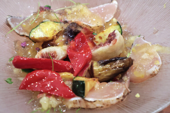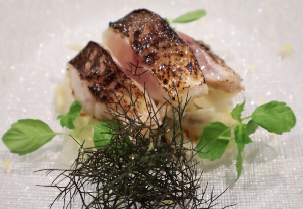 さわらの炙り、焼き茄子のプレッセ、シチリアのトラパネーゼソース。パラパラとかかっているのはモリカータ(味付きパン粉のサラサラトッピング)。
