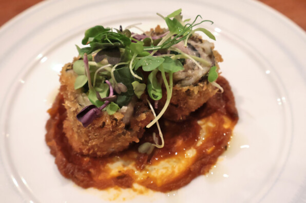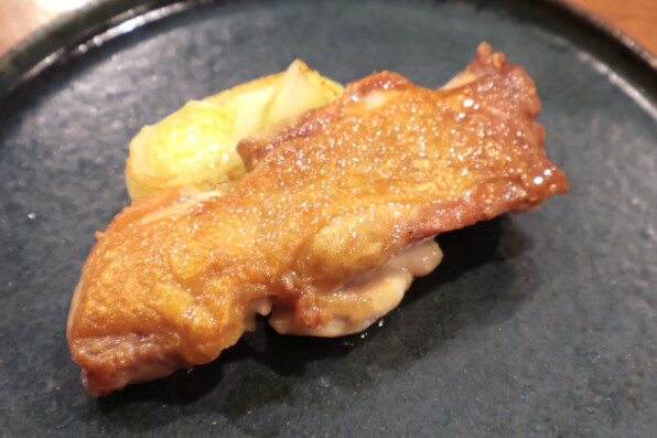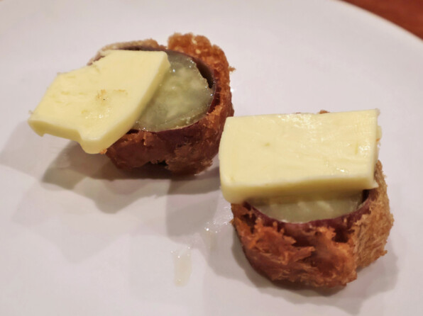 ●6皿目は、わたしが事前に所望したものです。看板料理のりすのろミンチカツに、だけきみを混ぜ込んでもらったものです。わかりやすく、うっまい~😂😂