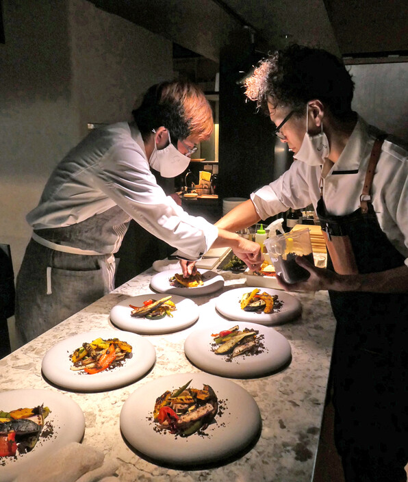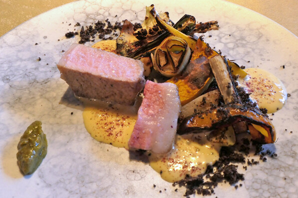 ●続く肉料理は、奈良からのばあく豚。炭火焼きの野菜をたっぷりと。