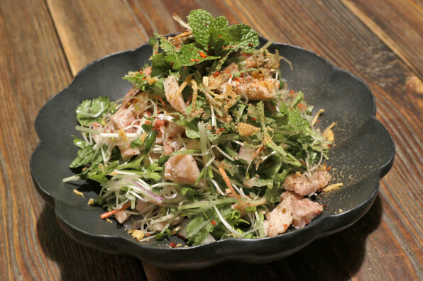 ラオス定番、肉とハーブのサラダ。肉は鶏豚牛の中から選べるので鶏肉。ミント、パクチー、ライム入り。きれいに切り揃えられた野菜は口当たりがよく香り高く、肉の旨味と一体になってたまらなーく美味。塩気が絶妙に控えめなのもよかったです。