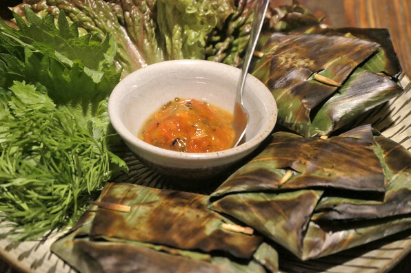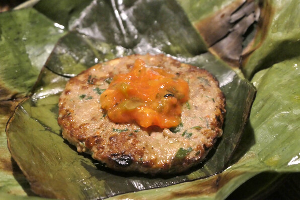 ラオス風牛つくねのバナナの葉包み焼き。牛つくねにはハーブ色々と唐辛子入りで、エグゾティックな香り。トマトのピリ辛ソースに、ディルや大葉やパクチーと共に味わうと、ここはどこ?なおいしさでした。感動深かったです。