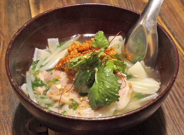 ラオス北部の名物ヌードルで、豚肉ベースのスープということ。太め平たい米麺です。肉みそはラオスの塩納豆と豚ひき肉とトマトで作ったもの。