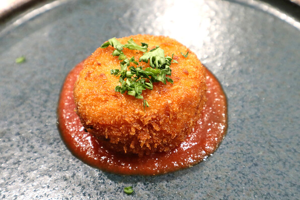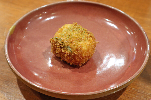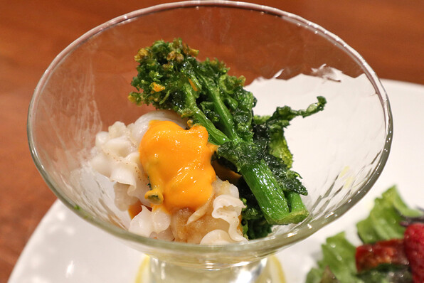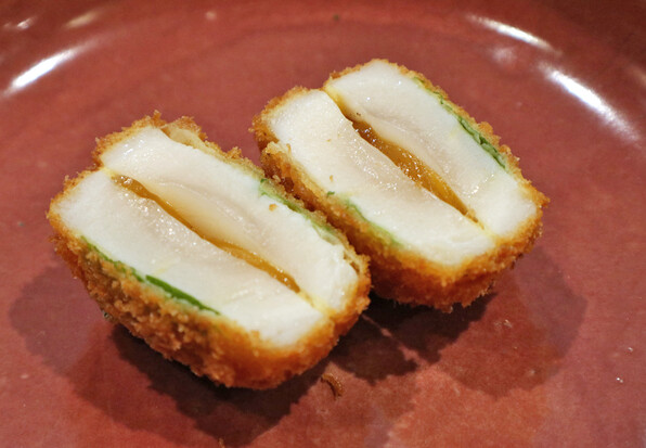 淡雪部分は、かぶら蒸しの時のかぶらの食感を思い浮かべてください。そのふわふわかぶらと卵白で淡雪仕立て、中にマスタード柚子味噌が仕込まれていて、ふわふわと同時に旨みもあり、ものすごーくおいしい。