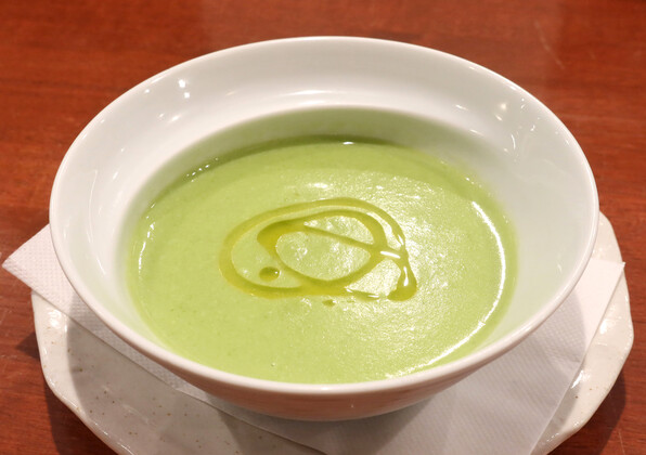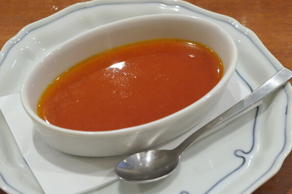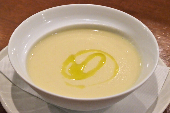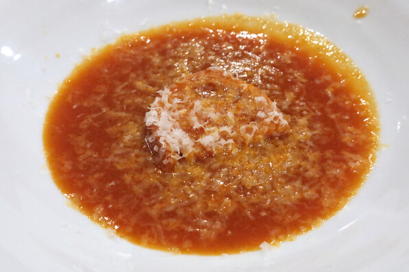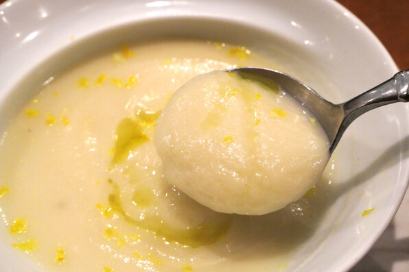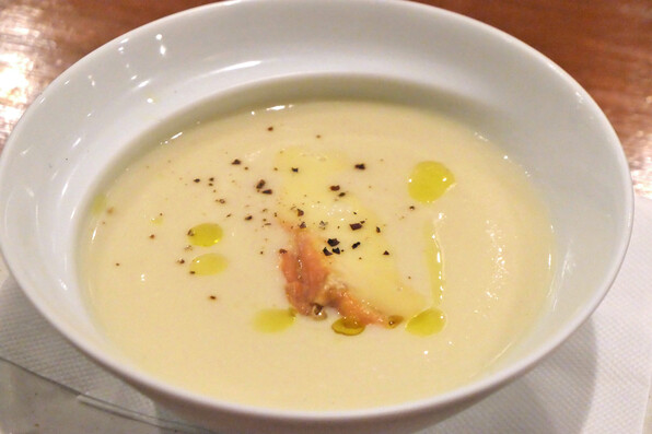 ●ひと皿め、濃厚白菜のスープはそれだけで圧倒的に旨いのに、サントモールドゥトゥレーヌが浮いていて、それが溶けかけていて強烈に美味で仰天。