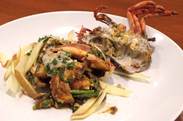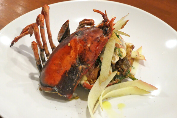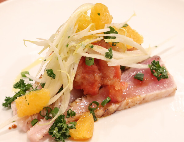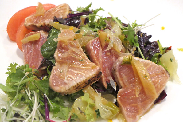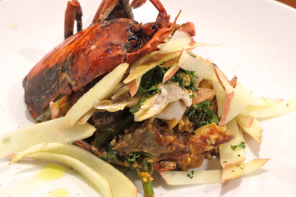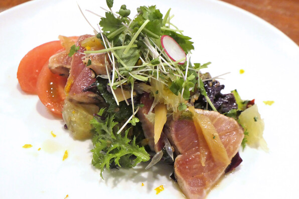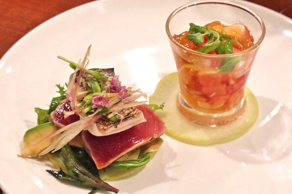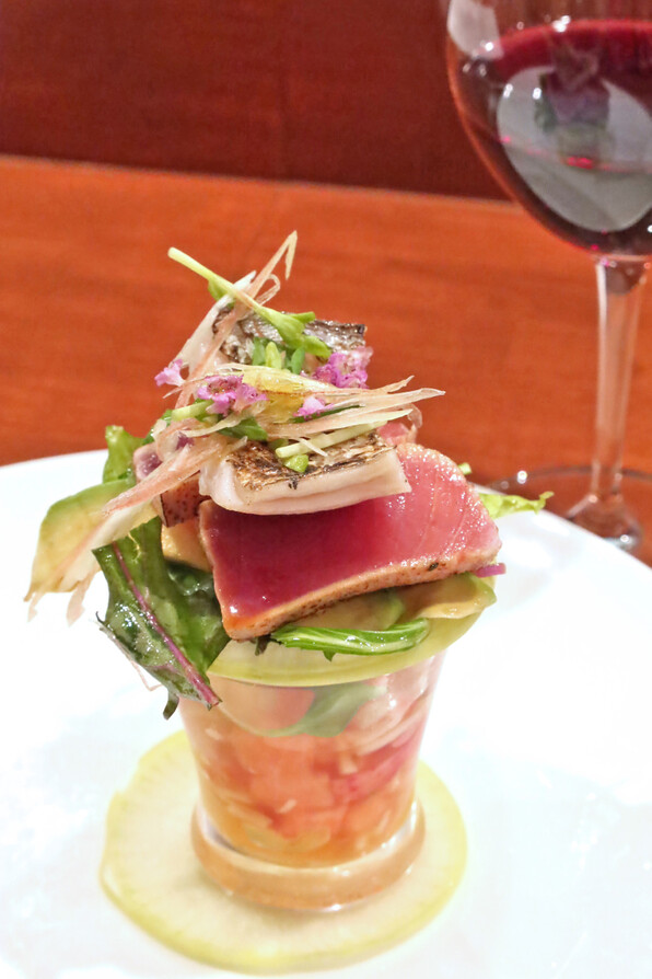 ●次に、0.5番手のとしちゃんの構築的な魚介サラダのお皿が供されました。