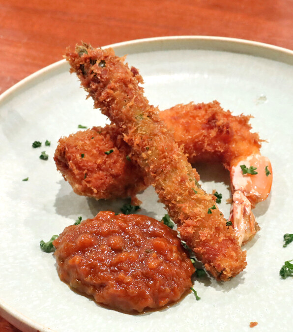 ●甘海老と帆立のなめろう風 オリーヴオイル、刻んだ玉ねぎ、ケイパー、アンチョヴィ、粒マスタード。まわりにトマト。