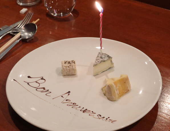 ●デセール、Bon Anniversaireと書いたお皿に風情のいいガトーショコラをのせて出してくれて大喜びしたんだけど、これ外注したお菓子とのことで、切って食べてみたらまさかの、ショコラとショコラの層の間に、わたしがこの世で最も好きではない組み合わせのフランボワーズのコンフィチュールが塗ってあって、大笑いしたのでした。作ってくださった方は気を利かせてアクセントにしてくれたんだろうが、わたしにおいてはショコラとフランボワーズの組み合わせは警察を呼びたくなるレヴェルでダメなのよー(^o^)(^o^)