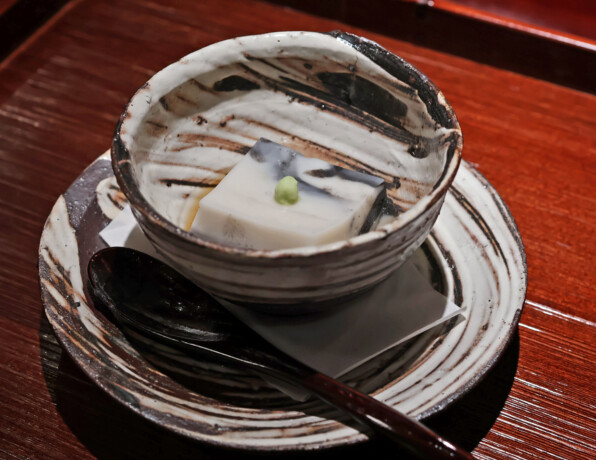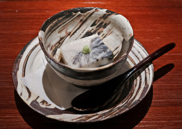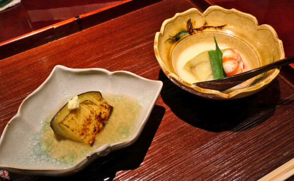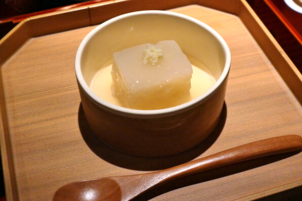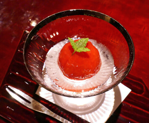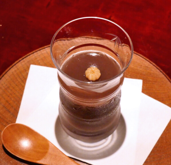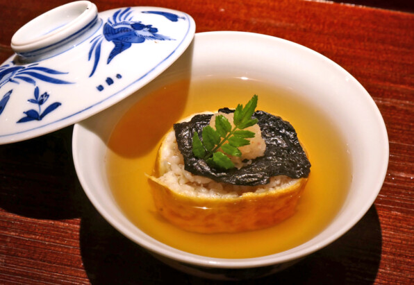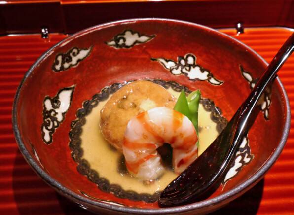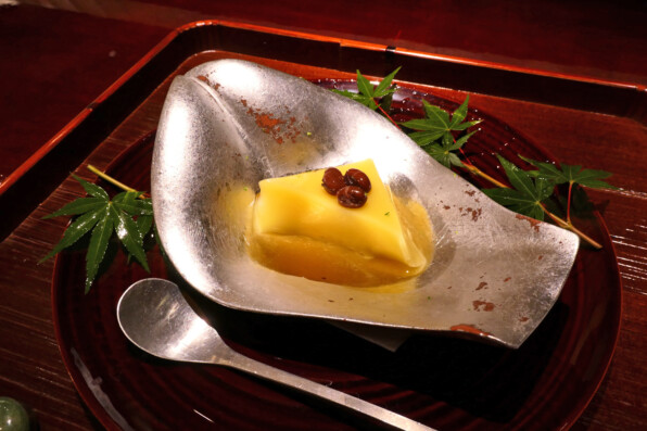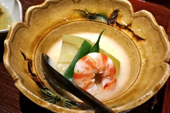 ●ひと皿め、金時にんじんの茶碗蒸し、中に百合根。