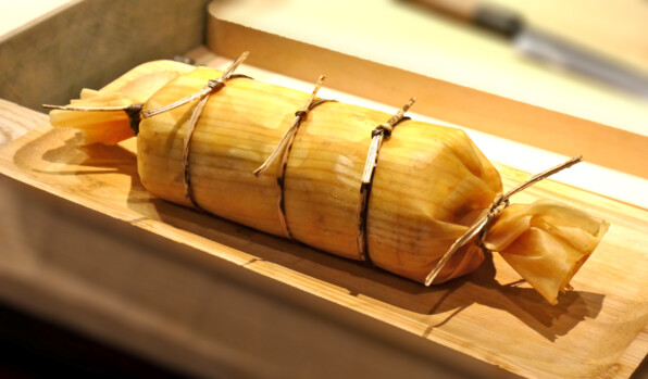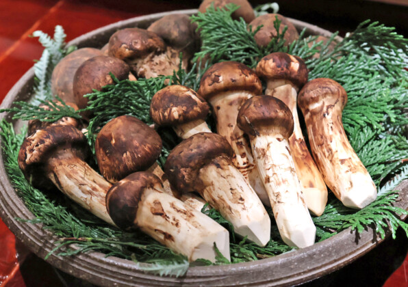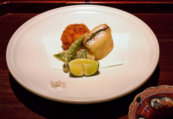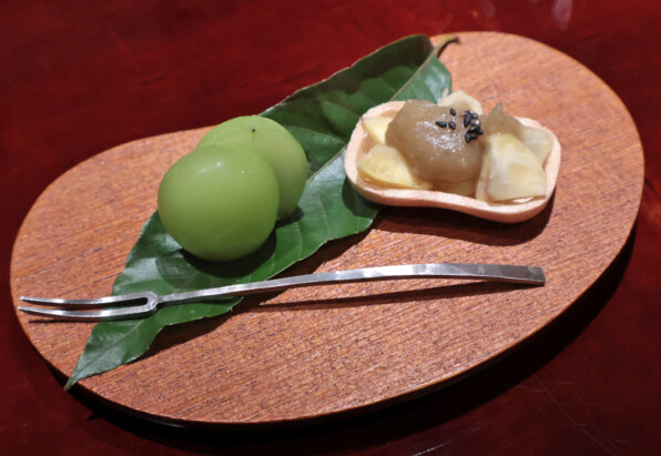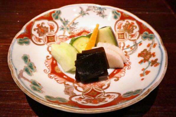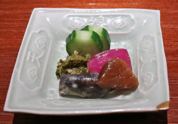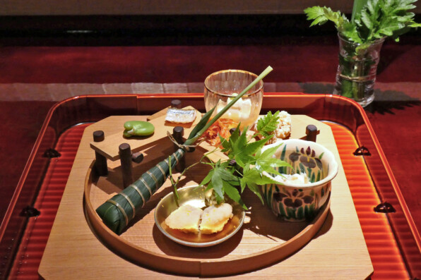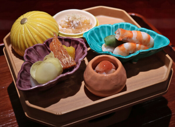 干し柿とかぶらの砧巻き、香茸、数の子、車海老/川越のお芋とくわい/いくら味噌漬け