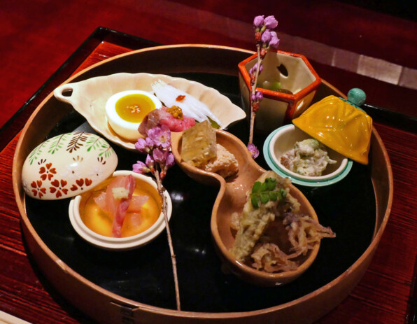 ●瓢箪の形の器に、もろこ天ぷら、ほたるいか天ぷら、鯛の子、ふぐの煮凝り。