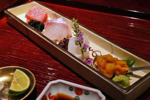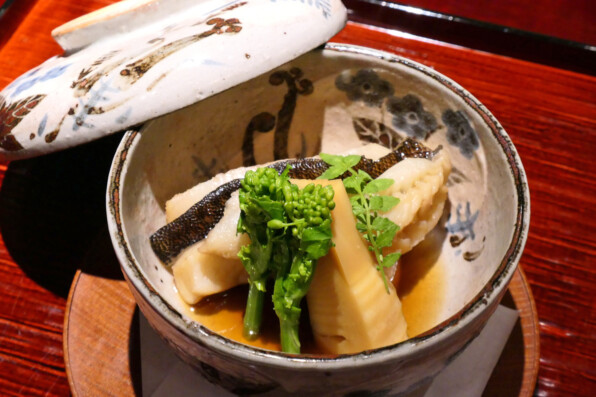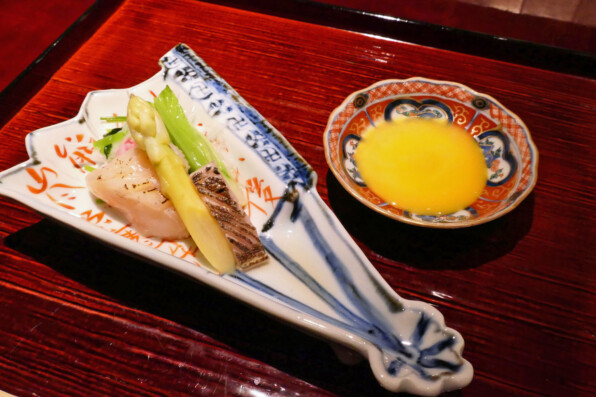 桜の器に、鯛の昆布〆、生姜酢のあん。お酒飲みの方には酒盗のせ。