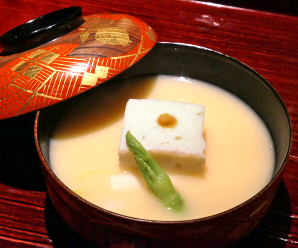●白味噌のお椀。生湯葉しんじょう、辛子、たらの芽。うるい。
