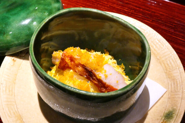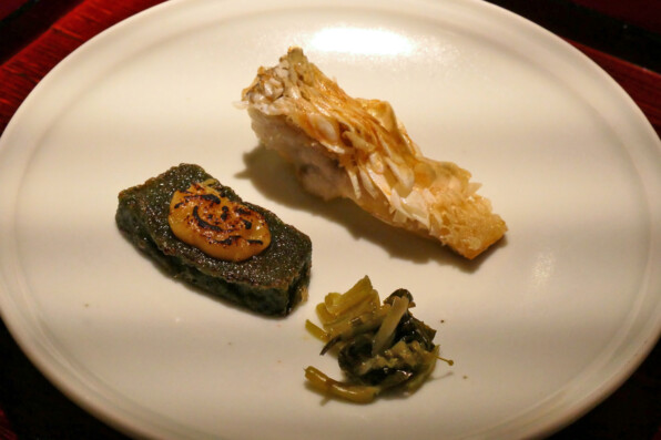 ●甘鯛のうろこ焼き。よもぎ麩田楽、花わさび醤油漬け。