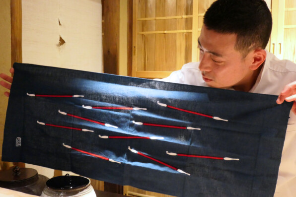 ●南 建吾さんの、今月の手ぬぐいコーナー。青地に赤と白で、フランスカラーではないの(^o^)♪