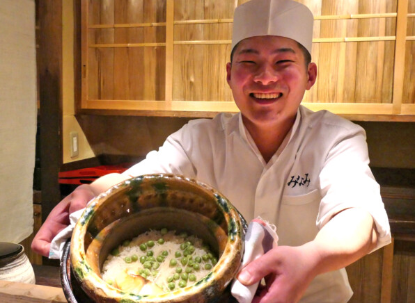 うすいえんどう豆と桜ますのご飯。針生姜。