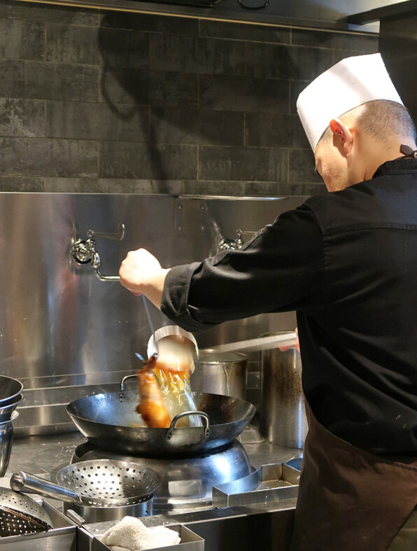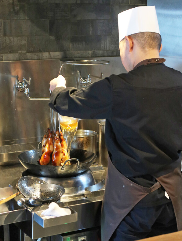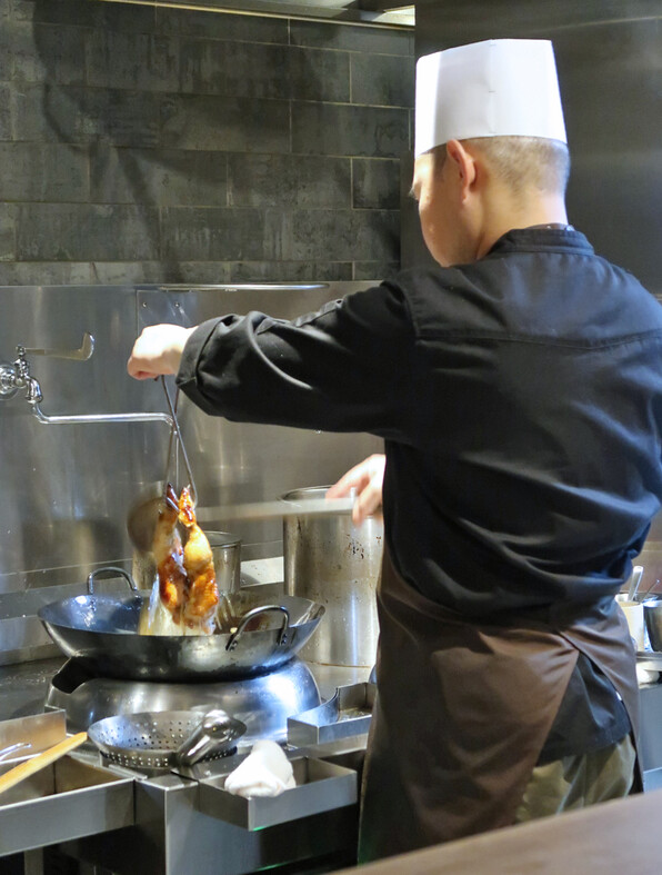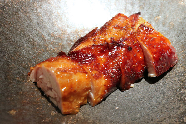 ●広東式鶏のローストです。鶏のもも肉、すでに火を入れてあるものを、油をじゃんじゃんかけて皮をパリパリにしています。