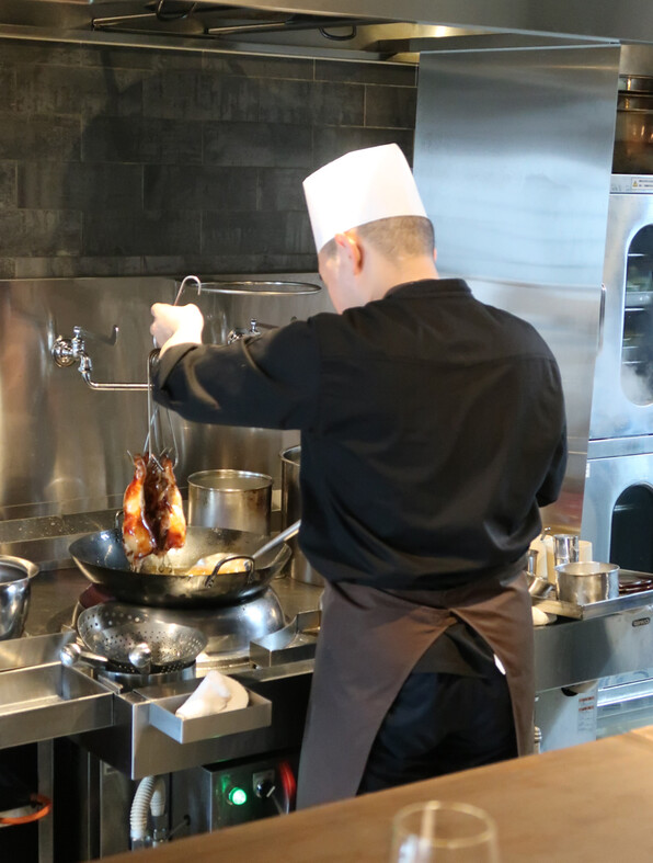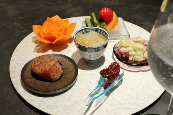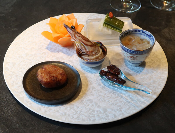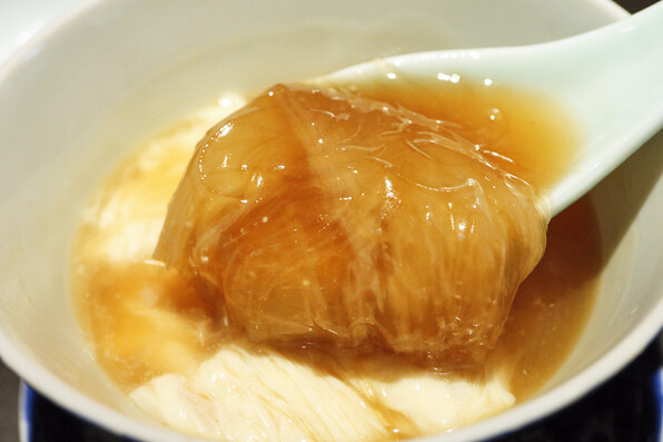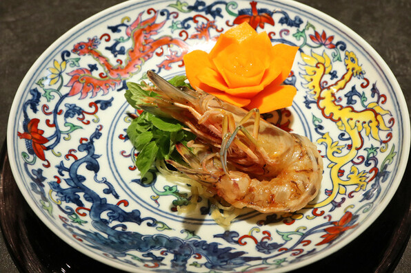 モダンな店内ですが、器は景徳鎮を中心にガラスや青磁が使われ、美麗で見飽きることがありませんでした。紹興酒に漬けた海老も、ぶ厚いふかひれも、上湯スープも、麺も、何もかも、ジャストに味が決まって美味の連続、ものすごくよかったです。