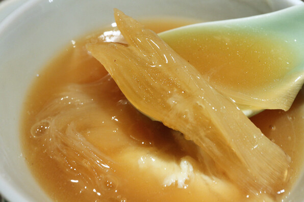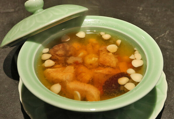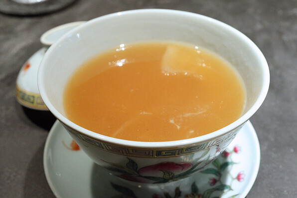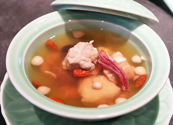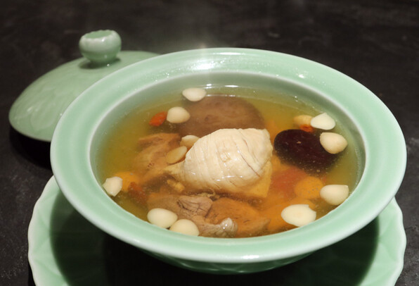 ●蒸しスープは7時間蒸したものとのこと。上湯スープに、鶏肉、蓮の実、杏仁、くこの実、なつめ、花椎茸、干し貝柱、金華ハム。