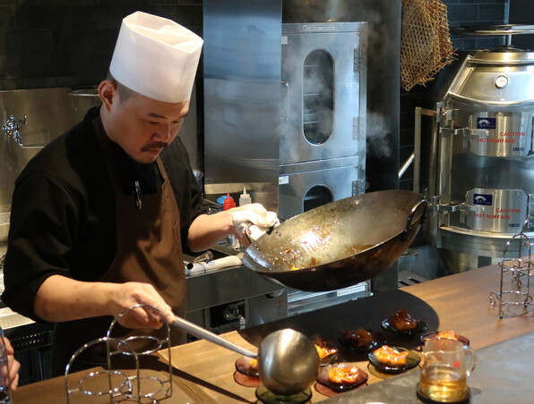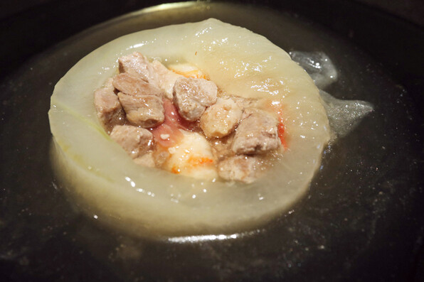●そっと薄絹のような冬瓜をはがすと、海の幸山の幸が詰められているというわけ。蟹、海老、鴨、金華ハム。