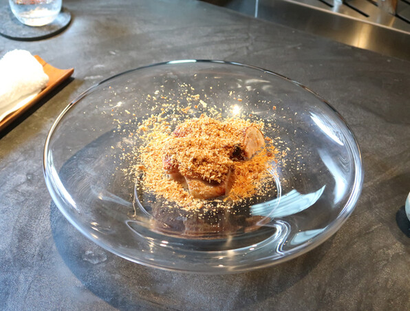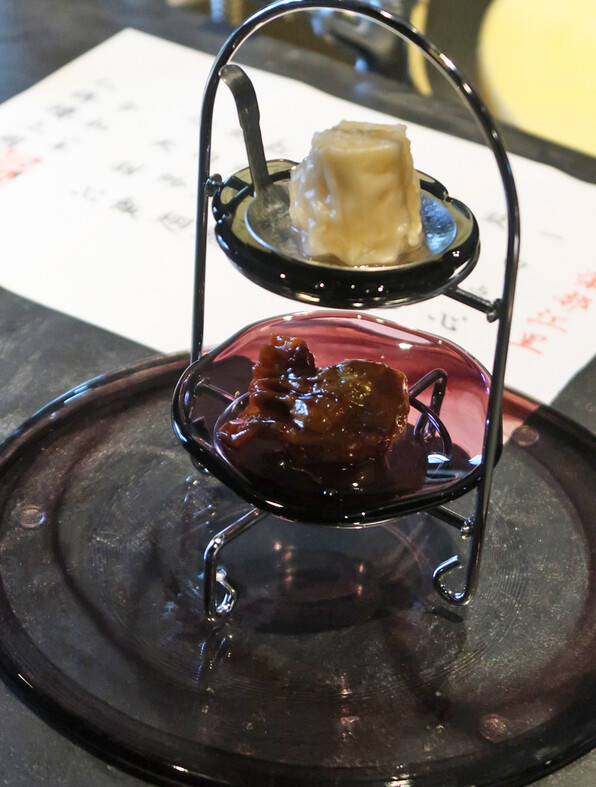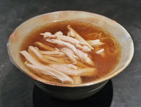 ●前菜の続きで、よだれ鶏。夕方に蒸して、冷やさずにスープに浸けおいたというもの。いまだかつてないような食感。なめらかさと柔らかさがたまらないと思いました。上にかかっているもろもろがまた風味を添えて旨かったです。