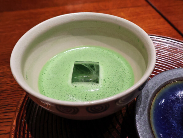 目が覚めるほど抹茶の香りが広がるどら焼き生地に、なめらかな抹茶クリーム、そこにプチプチの玄米チップ、「堀井七茗園」さんの抹茶「宝来山」がかけられています。
