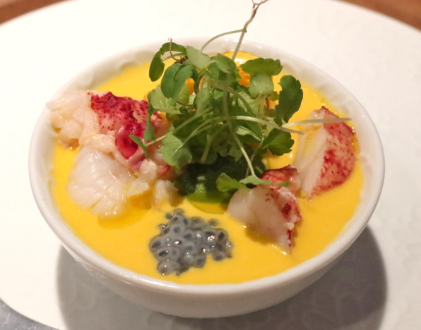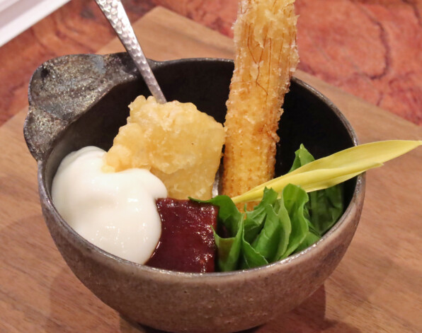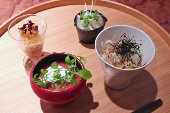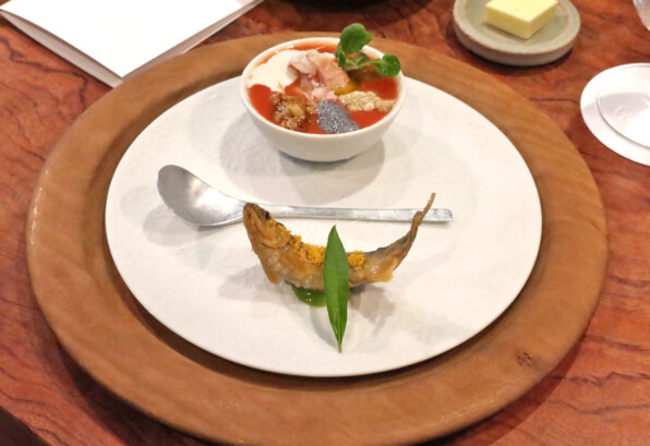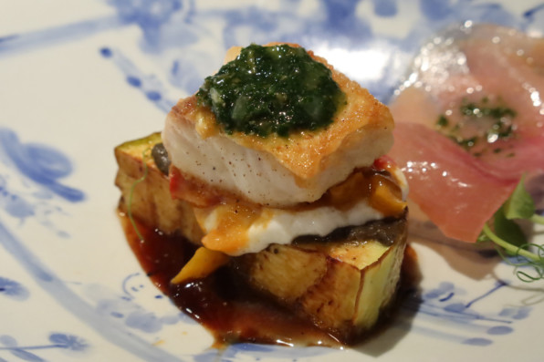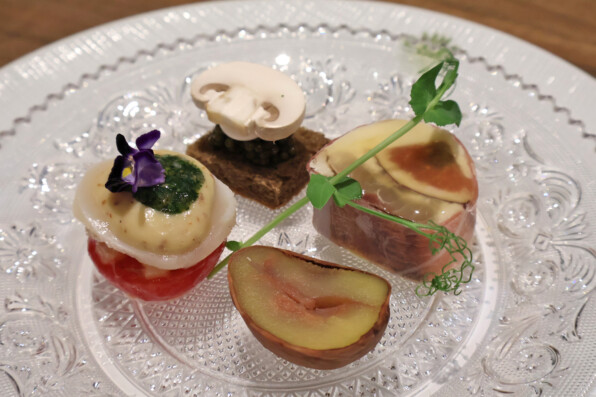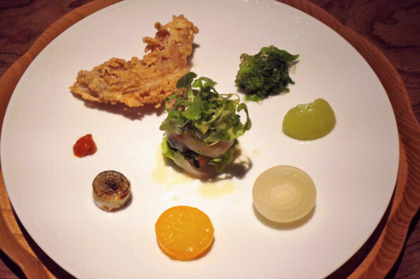 ・(中央)トマトの上にはりんご、帆立、白味噌の酢味噌ソース、フィヌゼルブソース。