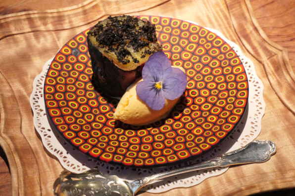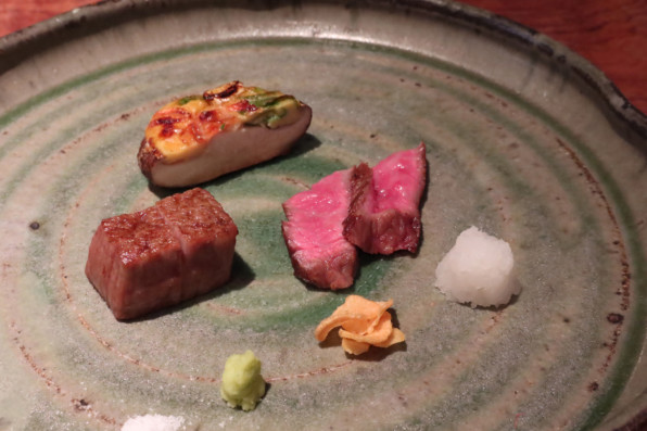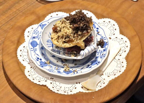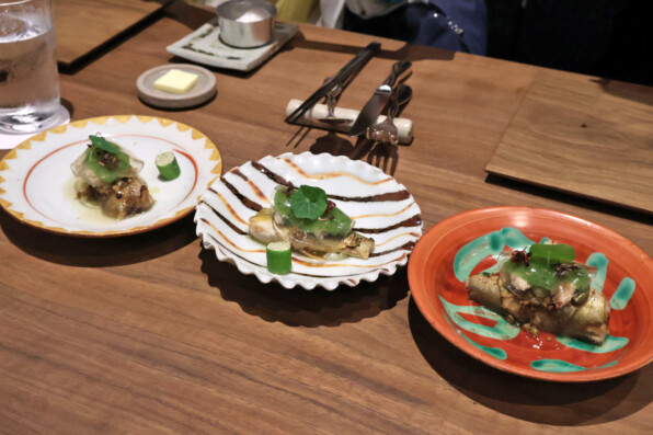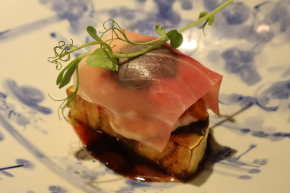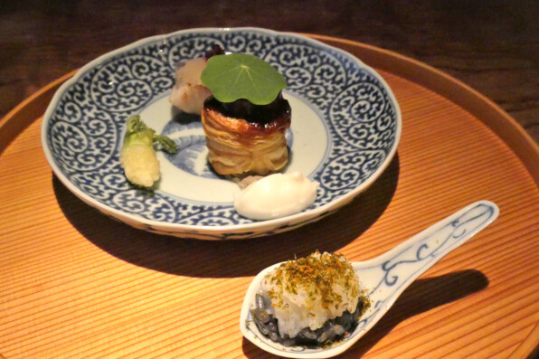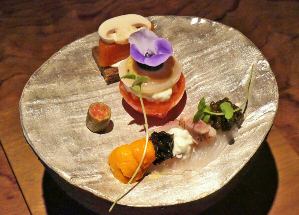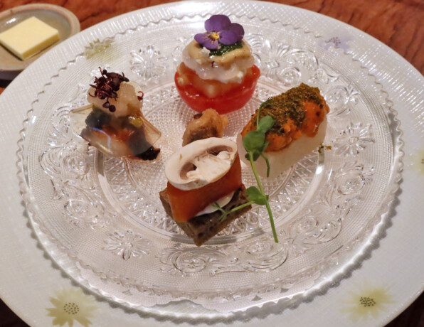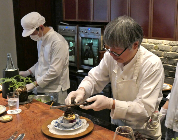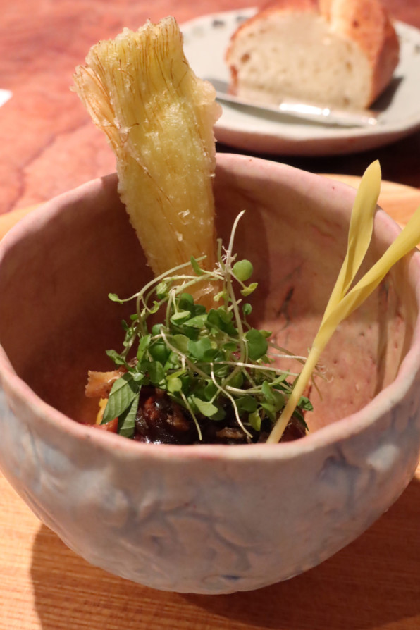 ・(奥)そば粉ブリオッシュの上には分厚いからすみ、昆布締めにしたマッシュルーム。