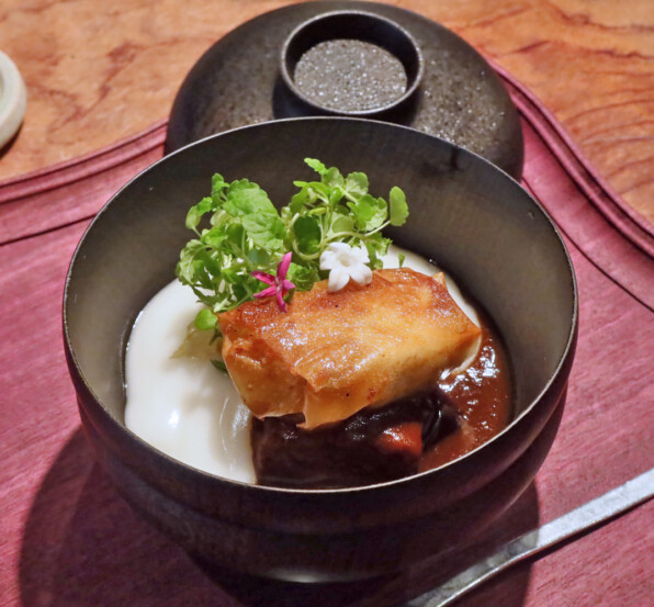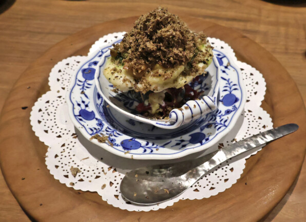サクサクの食感がたまらないパイには濃厚ビーフシチューが詰められていて、ごぼうピュレ、ナスタチウムの葉。