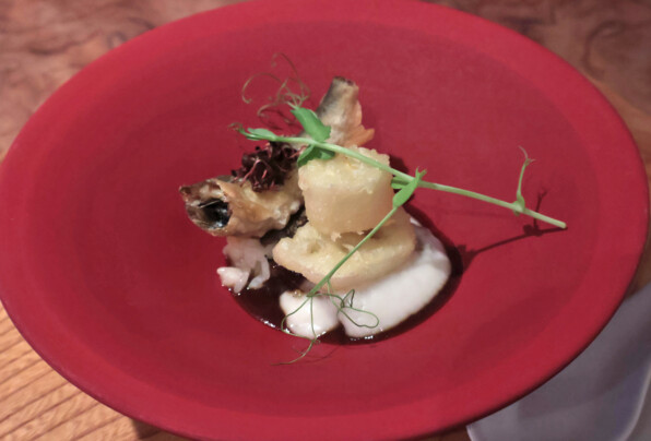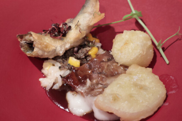 ●(お皿に)ビーフシチューパイ、蛸のコンフィ(わたしのは甘鯛です)