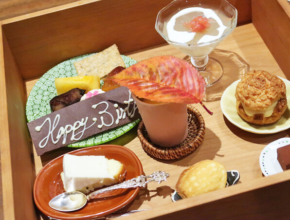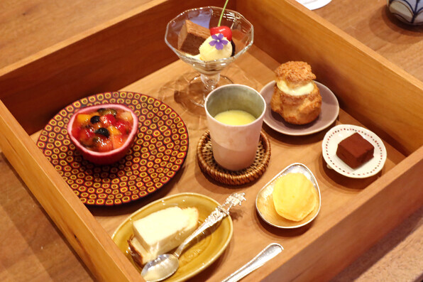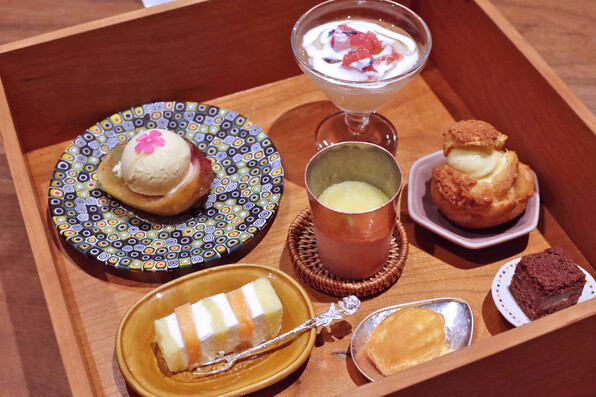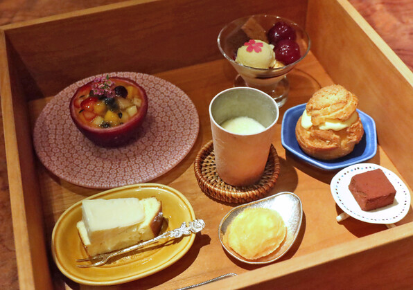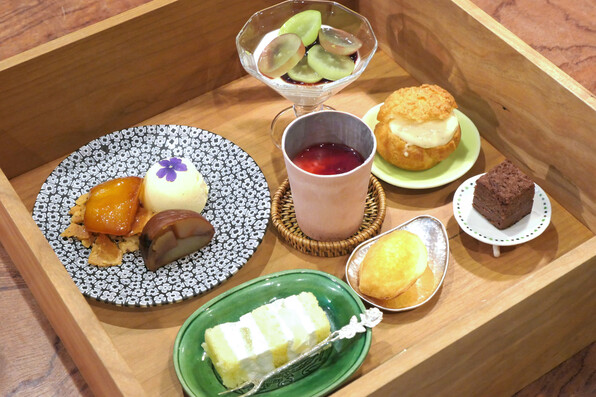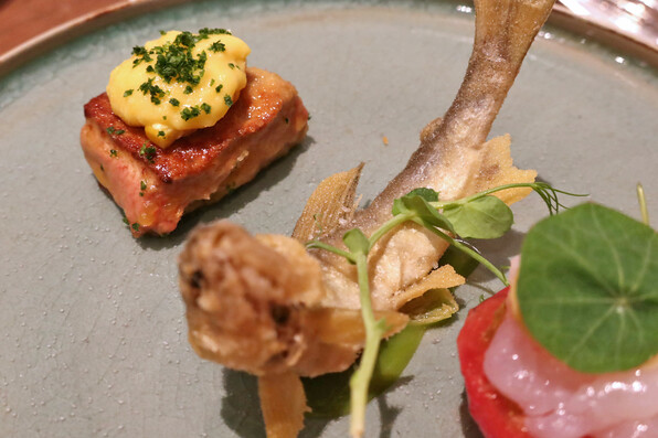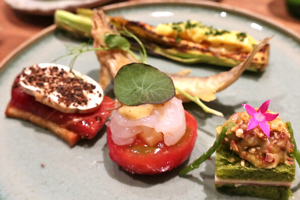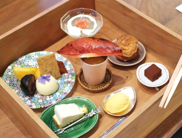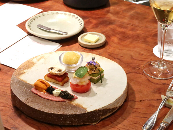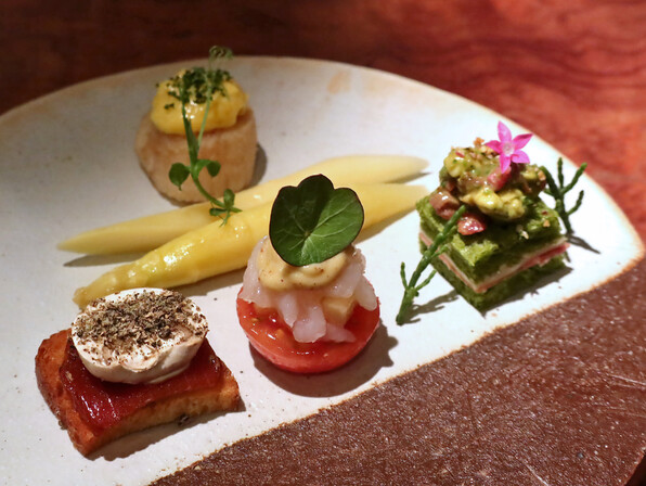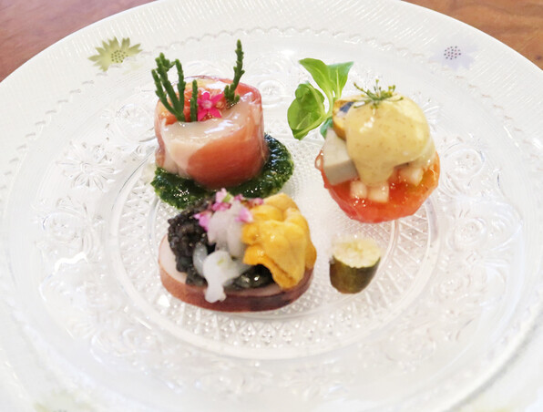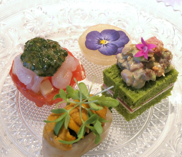 ●抹茶ブリオッシュのサンドウィッチ/トマトに白海老/まぐろのづけのカナペ