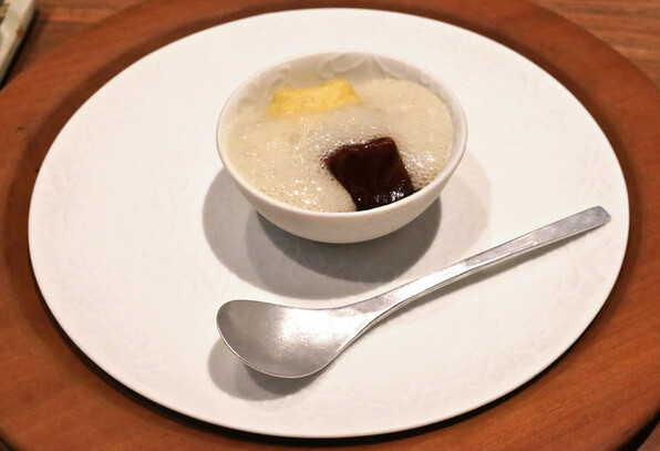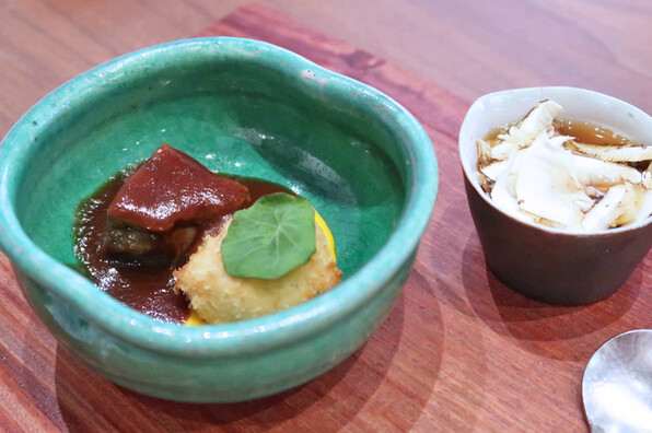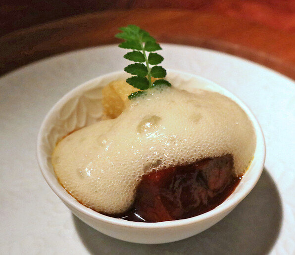 ●ビーフシチューとうどの天ぷら、キャベツとカリフラワーのエスプーマ、下にリゾット。