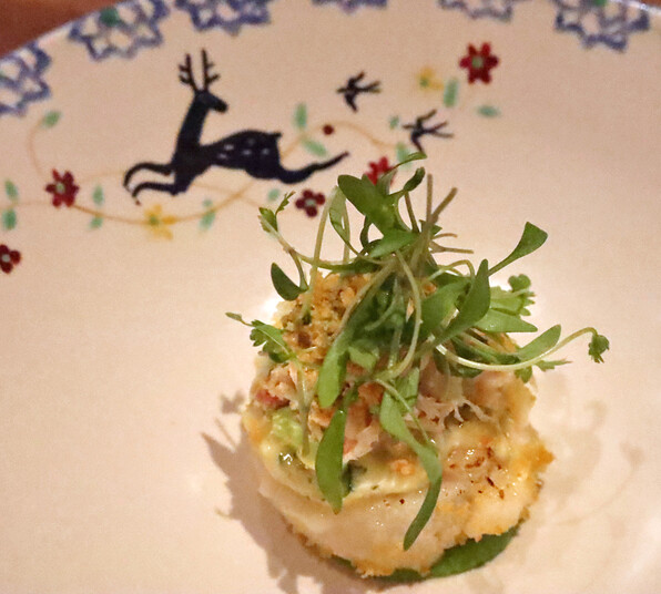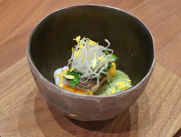 ●ほたて貝柱のムニエル 毛蟹、枝豆ピュレ、マイクロコリアンダー