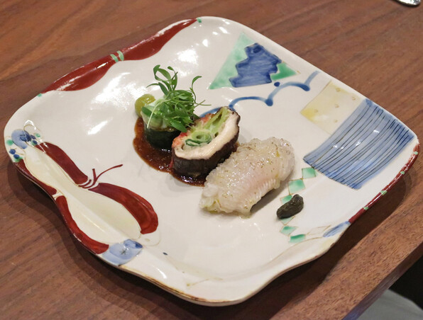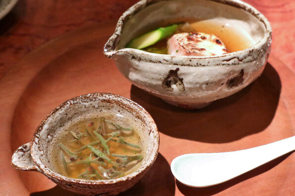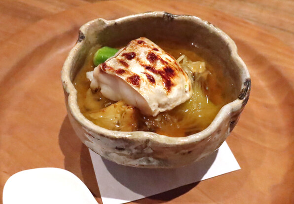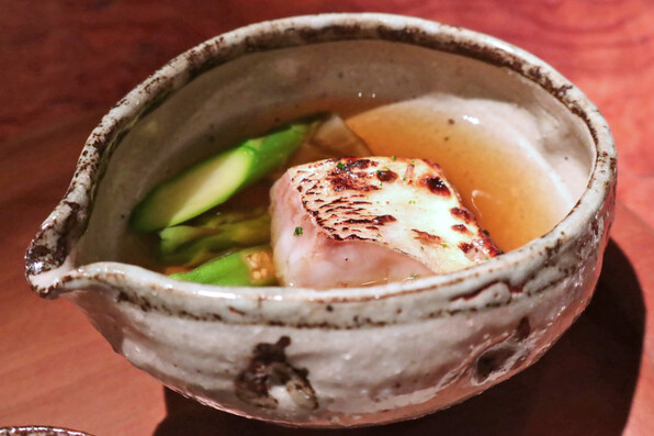 ●味噌漬けにしたぐじの炭火焼きとすっぽんスープ、松茸、糸瓜、賀茂茄子、おくら。
