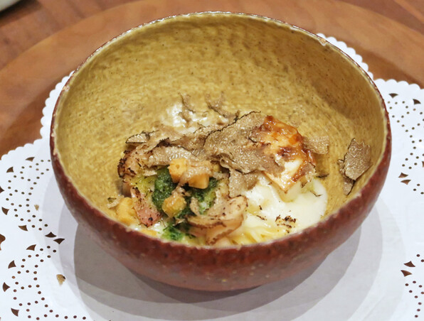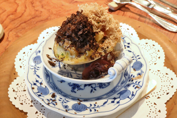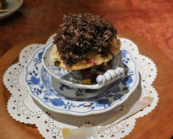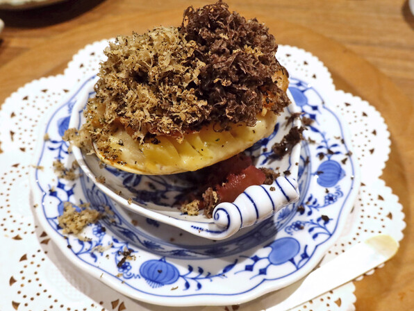 黒いトリュフと夏トリュフをわんさか、かつお節のようにかけてくれたはまぐりのグラタン、
