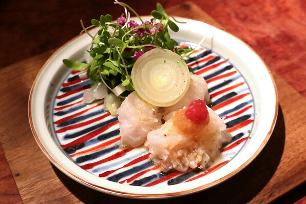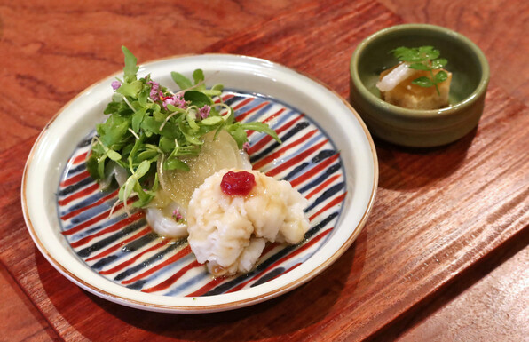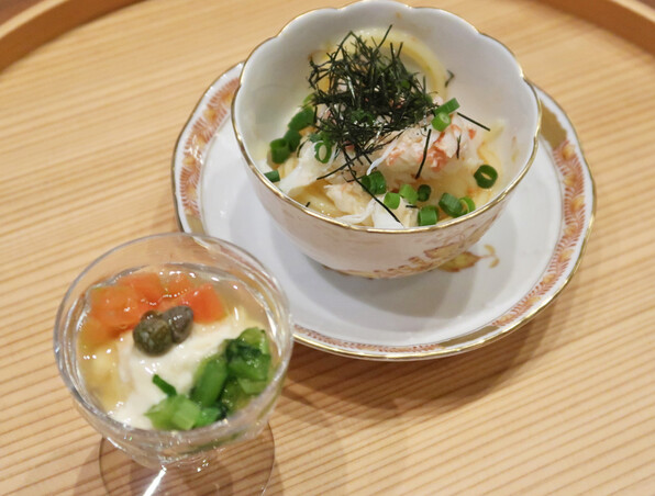 茗荷、海ぶどう、トマト、小松菜、湯葉、フィンガーライム、うずらの温泉卵