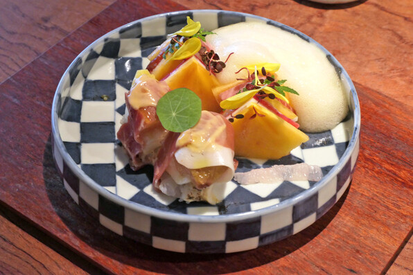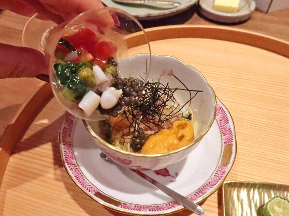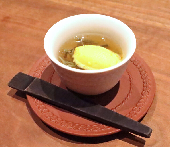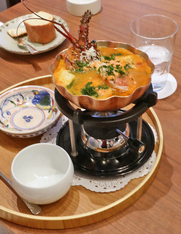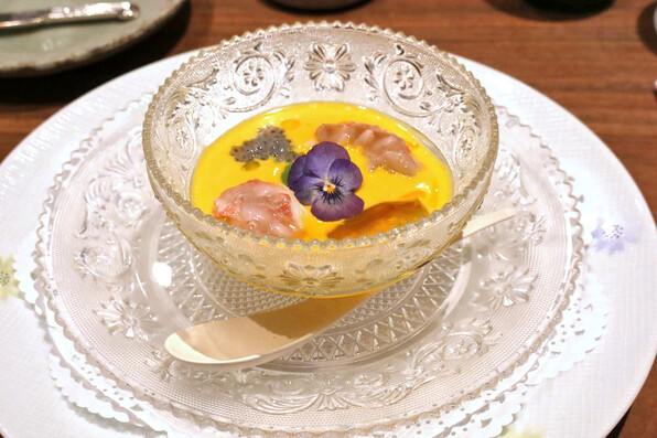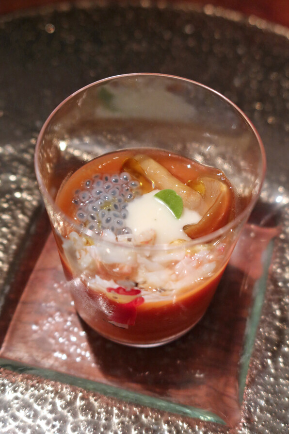 ●伊勢海老に、抹茶アイスクリームとアマレットのジュレを入れた南瓜の冷たいスープのひと皿めから組み合わせの妙とおいしさに圧倒されました。