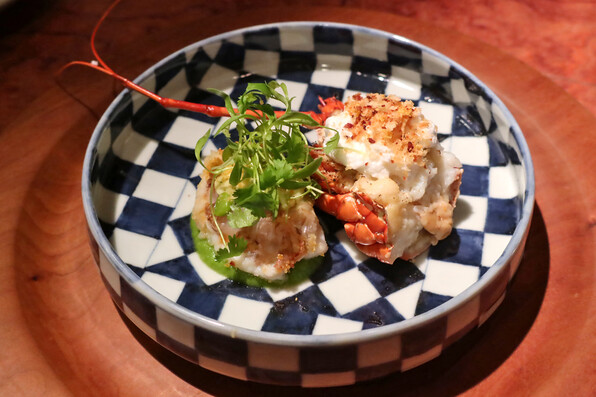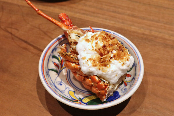 ●伊勢海老の頭の部分を香ばしく焼いたものにミルクのフォーム。上にパン粉とベーコンのパリパリパウダー、レモンの皮も。