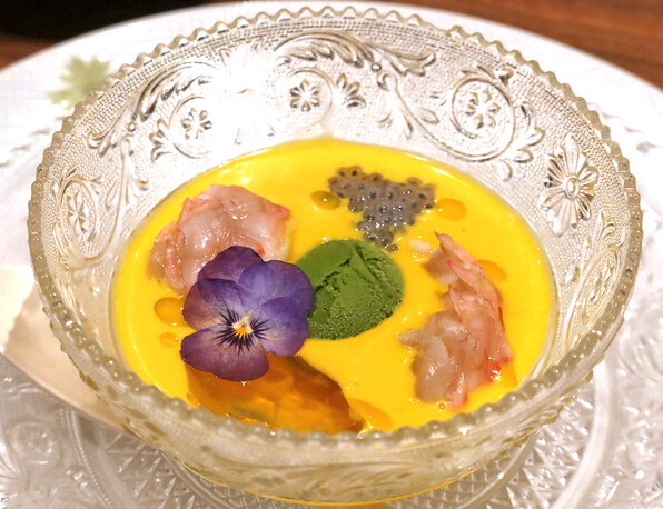 ●伊勢海老に、抹茶アイスクリームとアマレットのジュレを入れた南瓜の冷たいスープ