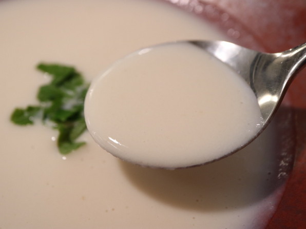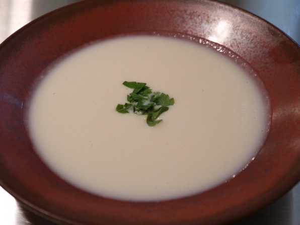 ●スープは桃でした。フルーツを使いながら塩味がばちっと決まった、見事なスープでした。