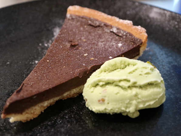 ●デセールに、わたしはショコラのタルトを選択。ピスターシュのグラス付き。
