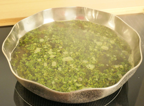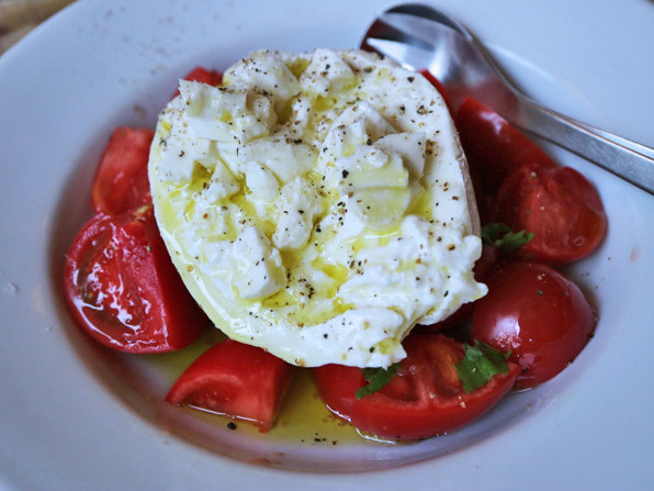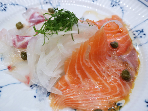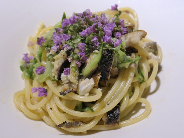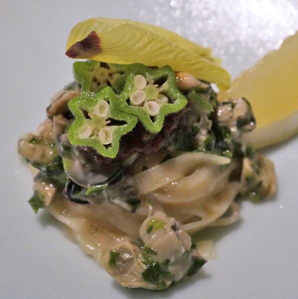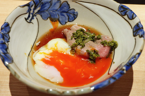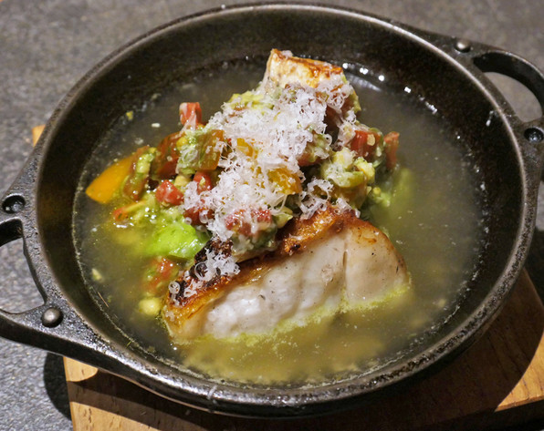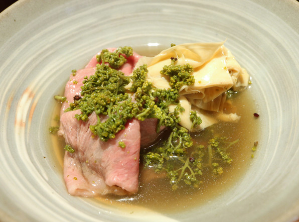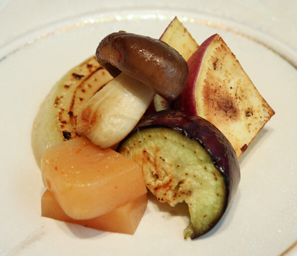 ●鮎の骨からとっただしと鶏節のだしを合わせたスープに浸った魚の一品。くえ、賀茂茄子素揚げ。吉田牧場のパルミジャーノ。