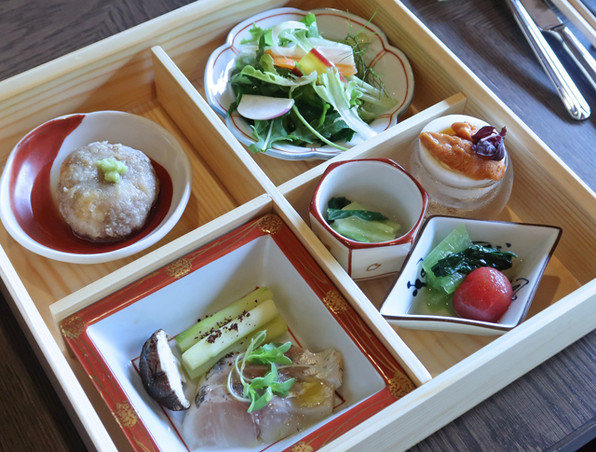 しまあじ、わさびのドレッシング/鯛の甘酢漬け/鶏肉ときのこと枝豆のテリーヌ/あわびの旨煮、ジェノヴェーゼソース/ローストビーフ