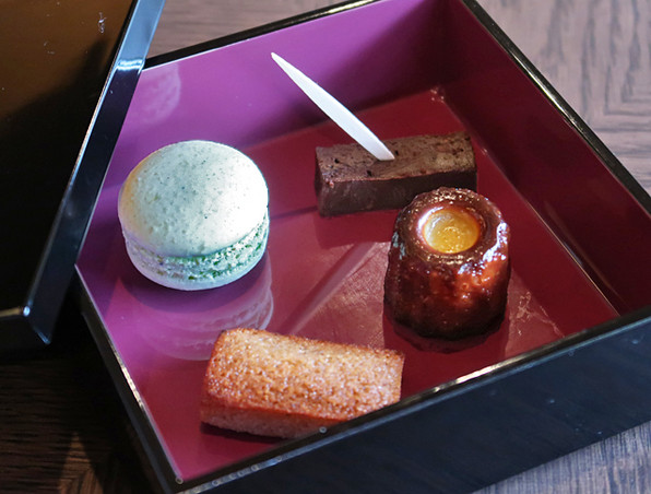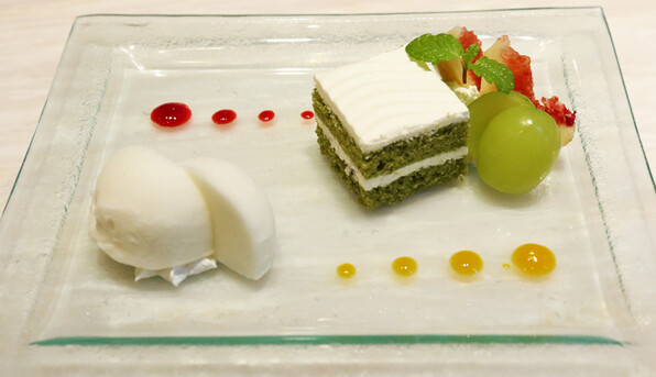 ●デセールはこんな。洋梨ソルベ、抹茶と小豆の小さなガトーに、シャインマスカット、いちじく。