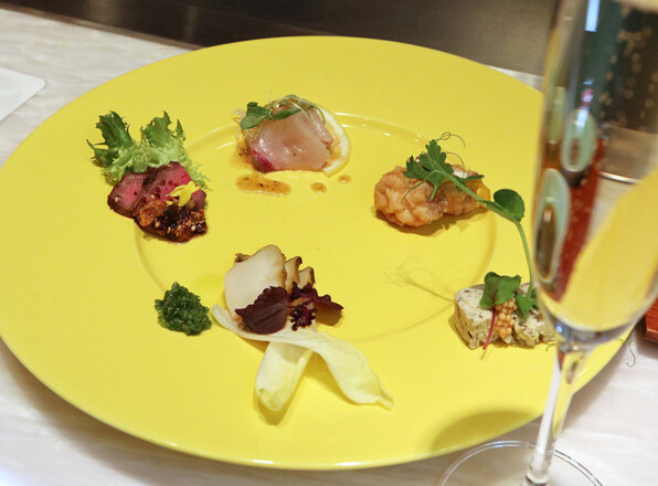 ●前菜5種類盛り。ヴーヴ・クリコと。
